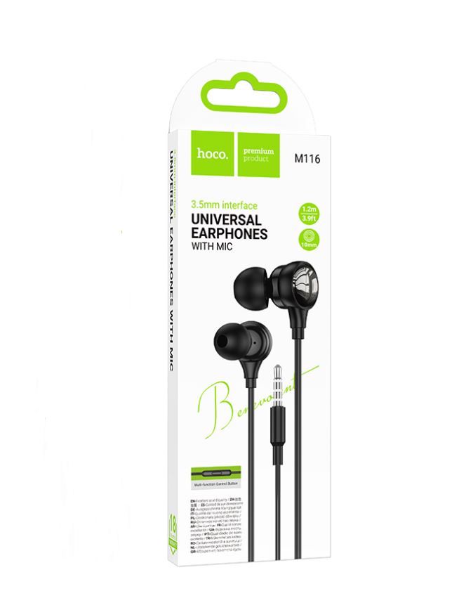 HOCO M116 — это универсальные проводные наушники с разъёмом 3,5 мм, идеально подходящие для смартфонов, ноутбуков, планшетов и аудиоустройств.