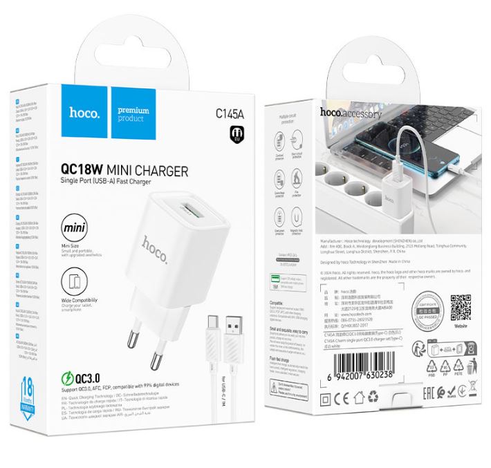 Главная Ι Зарядные устройства Ι Сетевое зарядное устройство для телефонов Ι СЗУ HOCOСетевое зарядное устройство с USB HOCO C145A MINI Charger, QC18W, кабель USB-C, белое