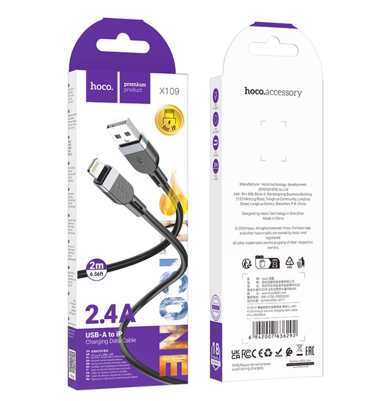 Надёжный и гибкий силиконовый кабель X109 Energy iP длиной 2 метра — идеальное решение для ежедневной зарядки и передачи данных. Подходит для iPhone и других устройств с разъёмом Lightning. Благодаря прочной конструкции и качественным материалам он выдерживает интенсивное использование, сохраняя гибкость и долговечность даже при частых перегибах.