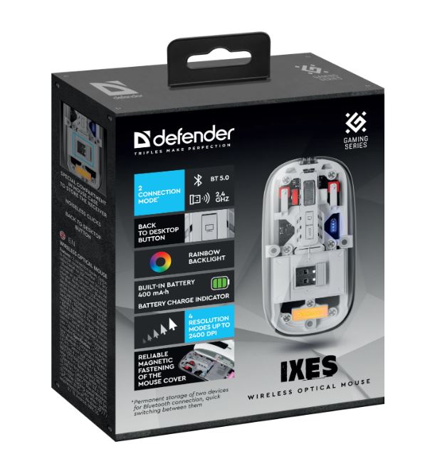 Ixes MM-999 — это ультратонкая беспроводная мышь с эффектным прозрачным корпусом, бесшумными кнопками и мягкой RGB-подсветкой. Она поддерживает два режима подключения: Bluetooth 5.2 и 2.4 ГГц (через USB-адаптер), а также запоминает два Bluetooth-устройства для мгновенного переключения между ними.