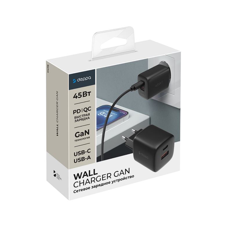 Сетевое зарядное устройство Deppa GaN 45 Вт — USB-C + USB-A, PD 3.0, QC 4.0+, PPS, чёрное
