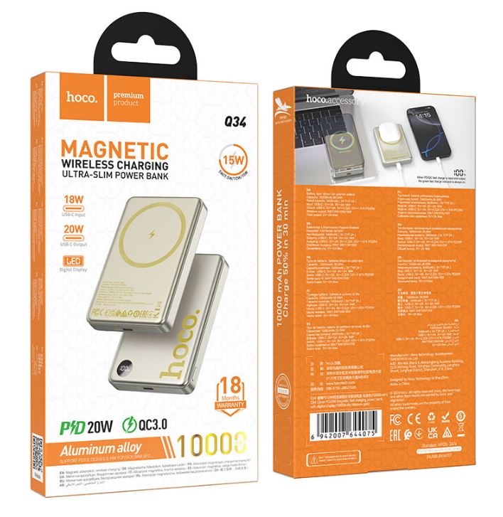 Мобильный внешний аккумулятор Q34 Clever — 10000 мАч, MagSafe, беспроводная зарядка 5/7.5/10/15 Вт, Type-C, цифровой дисплей