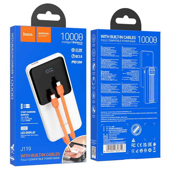 Главная Ι Зарядные устройства Ι Портативное зарядное устройство Power Bank Ι Портативное З/У 10000-11000mAhАккумулятор внешний HOCO J119, Sharp charger, 10000mAh, PD20W, QC3.0, белый