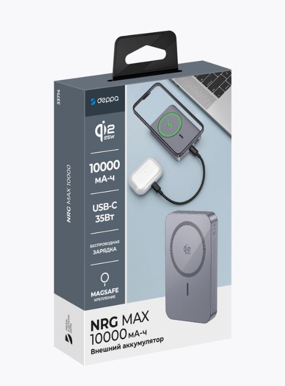 Deppa NRG Max Qi2.2 — это мощный power bank ёмкостью 10000 мА·ч с поддержкой беспроводной зарядки Qi 2.2 и магнитным креплением MagSafe.