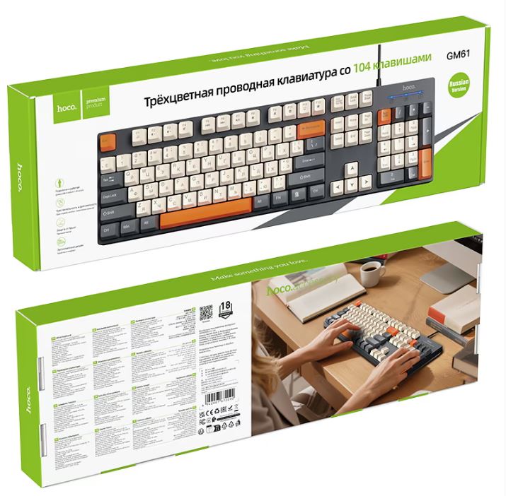 Клавиатура HOCO GM61 Murphy — проводная, 104 клавиши, 3-цветная раскладка, защита от брызг, русская версия