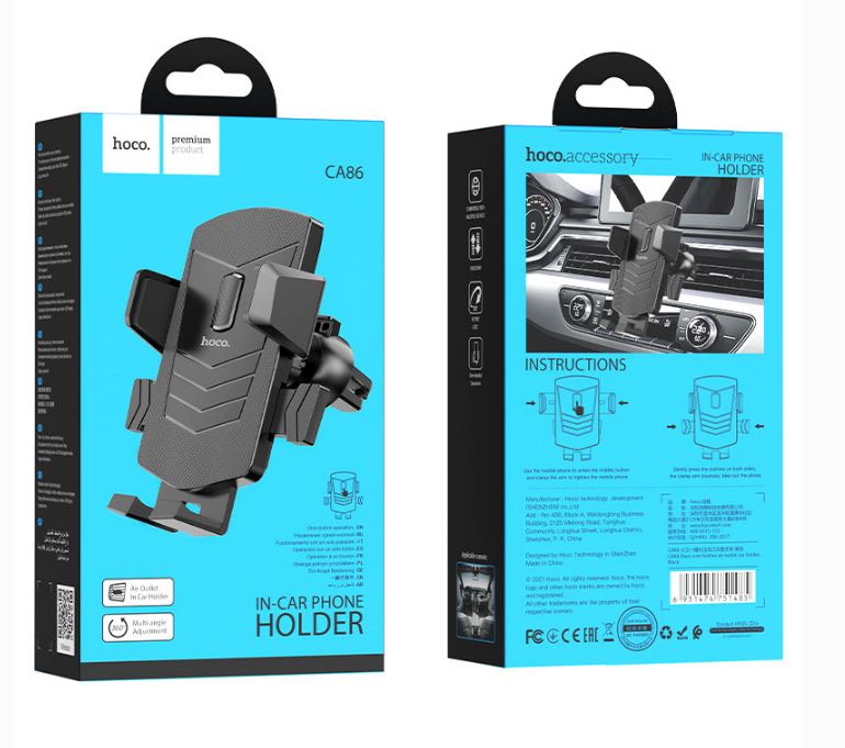 Hoco CA86 Davy — это компактный автомобильный держатель, который крепится на вентиляционное отверстие и надежно удерживает смартфоны с диагональю экрана от 4,5 до 7 дюймов.